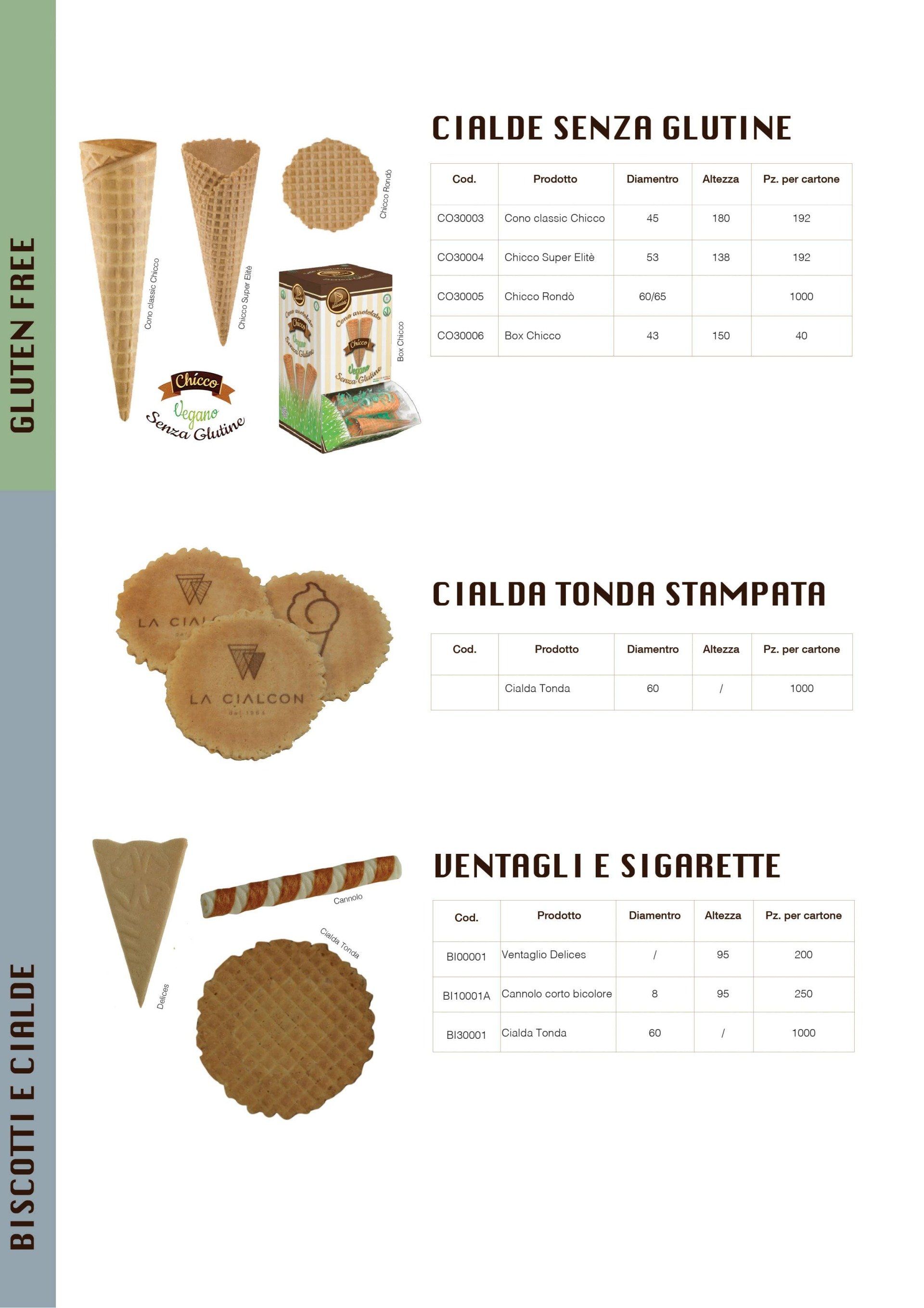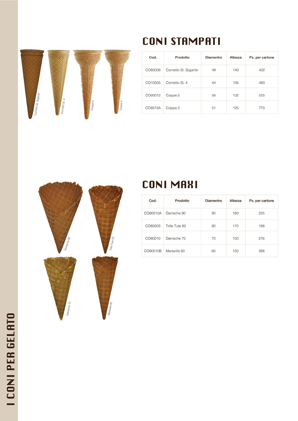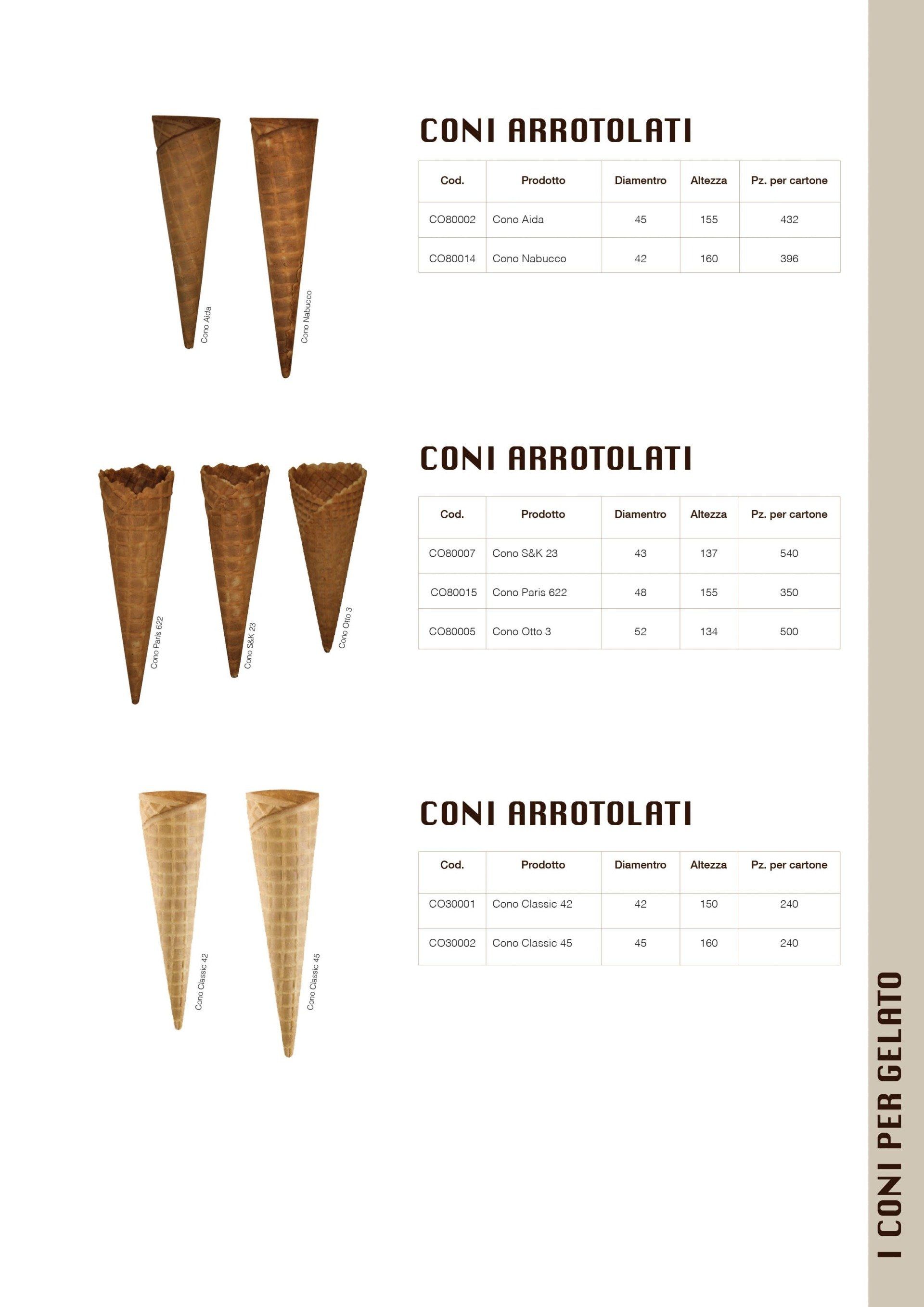 Nuova Ca’ D’Oro srl assicura tutta la dolcezza e la croccantezza del cono arrotolato in formato classico, con e senza ghiera, in diverse dimensioni: dal piccolo, per bambini, al classico, grande e maxi. L'assortimento include inoltre un ampia varietà di cialde: la maxi cialda e la cialda ricoperta di cioccolato, cioccolato e zuccherini, granella e cioccolato bianco e, per concludere, le coppette in cialda.